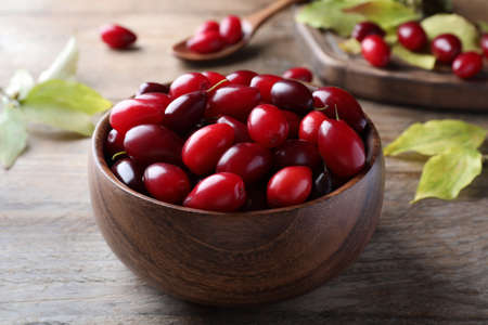 Bowl with fresh dogwood berries on light wooden background, closeup