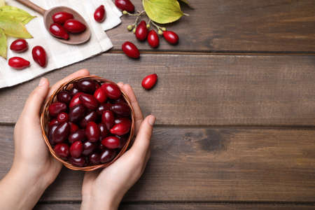 Woman with bowl of fresh ripe dogwood berries at wooden table, top view. Space for text