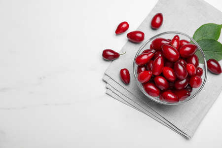 Fresh ripe dogwood berries on white marble table, flat lay. Space for text