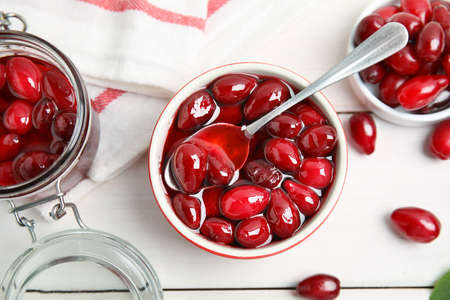 Dogwood cornel berry jam and ripe cornel berries on rural wooden background