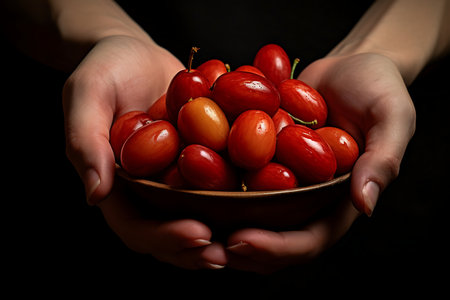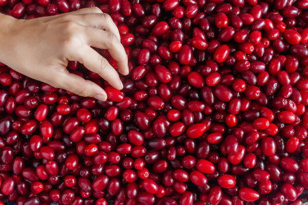 A womans hands hold a ripe red dogwood berry lying on a table against a background of many berries