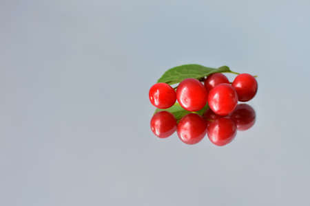 berries of ripe cherries and their reflection on a mirror surface, on an isolated background