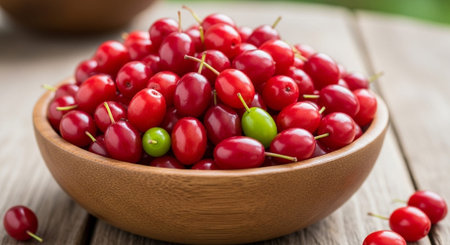 Top View of Dogwood Berries in Ceramic Bowl with Leaves