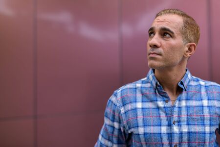 hispanic man in red cotton t-shirt feeling peace confident outdoors summer in downtown cape town