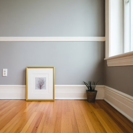 An interior space features a framed art piece leaning against a wall, a potted plant, and a wooden floor. The composition includes a window, trim, and light. The image may be suitable for illustrating design, home decor, or lifestyle concepts, useful for various commercial applications.