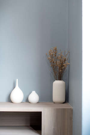 Minimal workspace with copy space and ceramic vase decorations on white table and white wall background