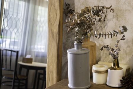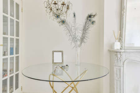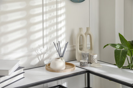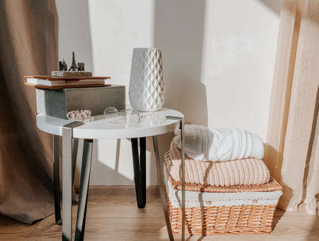Cozy Still life in sunshine appartment. Vase and books with some decor on white table