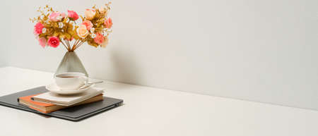 Simple white office desk with coffee cup, books, laptop, flower vase and copy space for product display over white wall. close-up image