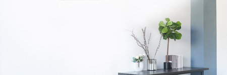 Banner composition with vases, dried flowers, books and a lyre-shaped ficus plant with green leaves. Part of the interior, perfect order in the house. High quality photo