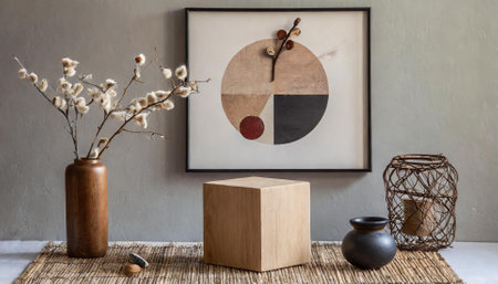 Stylish scandinavian living room interior design. Minimalistic scandinavian home decor. Modern scandinavian style. Composition of wooden cube, vase with pussy willow twigs.