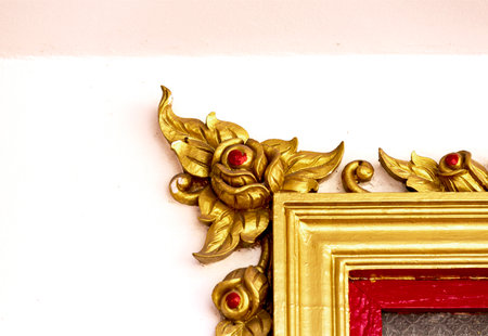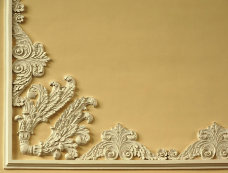 Expensive interior. Stucco elements on light luxury wall. White patterned. Mouldings element from gypsum.