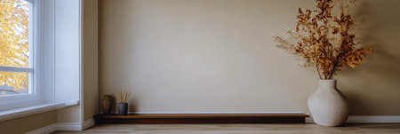 A serene room features a light beige wall and wooden flooring, illuminated by soft natural light from a nearby window. A large vase holds dried plants, adding warmth and texture.