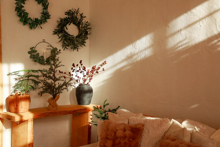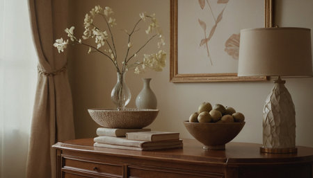 This serene interior captures the essence of minimalistic design with soft natural light illuminating elegant decor. The warm color palette combines comfort and beauty.