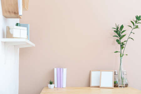 Cropped shot of modern home interior design with books, ceramic vase, mock-up frame and copy space