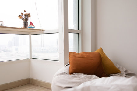 Relaxed bean bag sofa in the living room apartment with big windows.