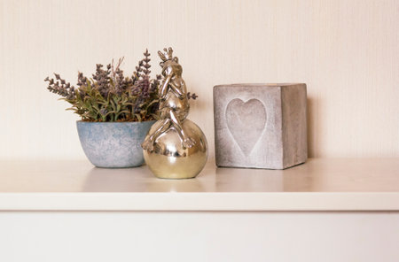 Still life from a vase with lavender, a figurine of a frog with a candle on a white table.
