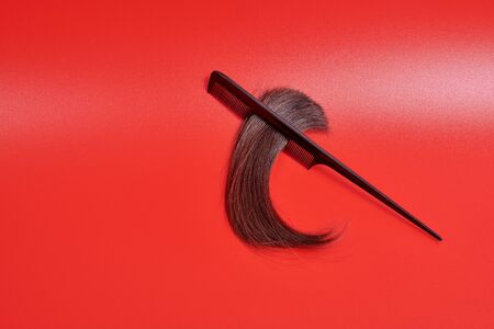 a tuft of hair in a curving tip to the bottom. a lock of brown glossy hair in the teeth of a comb lies against a red background