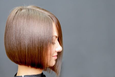 side view of face portrait of young woman with short hairstyle in the hairdress studio.