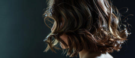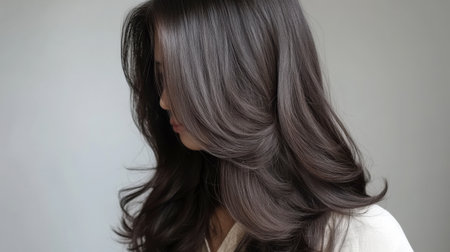 This captivating image features a profile view of a woman with long, dark hair styled in soft waves, embodying elegance and beauty. The smooth texture and healthy shine highlight modern hairstyle trends.