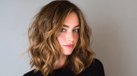 A captivating portrait of a young woman with flowing wavy brown hair, showcasing natural beauty and elegance against a soft, neutral backdrop. Perfect for beauty or fashion themes.