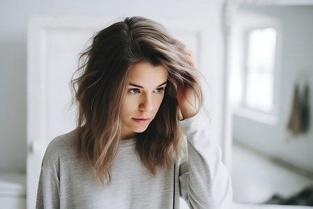 Young woman looks in mirror touch hair feels concerned due to receding, dry, dull hair. Hair loss common hair problem prevention, alopecia treatment ad, cosmetics products for female concept. horizontal photo