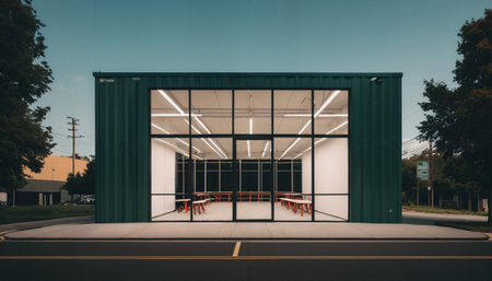 A repurposed shipping container that has been converted into a small, modern-looking space, possibly a shop or studio. The container is painted a dark green and features a large glass facade that spans almost the entire front. Inside, the walls are white, and there are simple wooden tables and stools arranged, suggesting a minimalist and functional interior design. The lighting is bright and even, likely from overhead fluorescent or LED lights. The container sits on a concrete pad next to a street, indicating an urban or suburban setting. The overall impression is one of clean lines, industrial chic, and adaptive reuse.