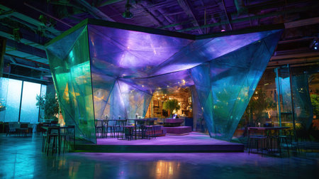 Bright center space features glass structures illuminated by neon lights in a dark venue, enhancing the modern geometric design and ambiance.