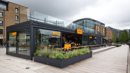 An exterior view captures a contemporary restaurant featuring a glass-walled structure and outdoor seating. The image showcases tables with chairs and a well-kept outdoor space. The overcast sky provides soft lighting over the building and the surrounding environment, suitable for various commercial or editorial applications.