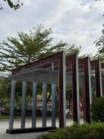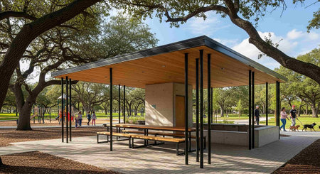 This image showcases a modern architectural pavilion set in an urban landscape, featuring sleek lines, lush greenery, and structured pathways. An inviting space for leisure and community interaction.