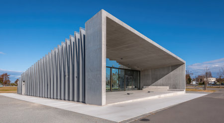 Sleek and minimalist structure showcases innovative architectural design with expansive glass elements. The buildings strong lines and concrete features are highlighted by a bright blue sky.