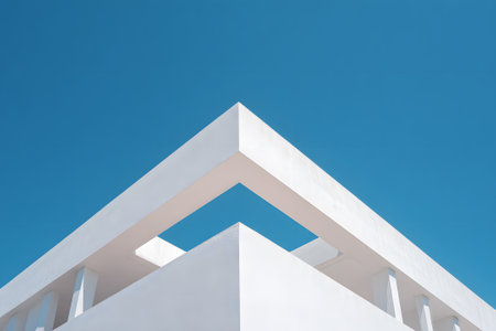 A minimalist structure showcases a flat rooftop supported by clean lines and smooth materials. The building stands against a serene blue sky emphasizing contemporary design aesthetics.