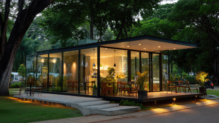 A compact urban pavilion with a fully glass exterior that blends seamlessly into the landscape. The structure showcases a cantilevered roof that provides shade while maintaining th