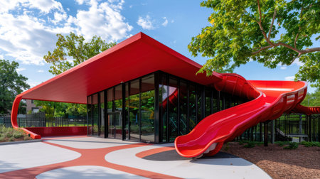 This vibrant red playground features a unique architectural design with a large curved slide. Surrounded by lush greenery, it invites exploration and fun for children.