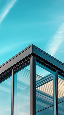 Low angle architectural shot focusing on the corner of a contemporary glass building with dark frames, set against a clear, bright blue sky with wispy cloud trails.