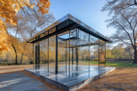 Glass and steel pavilion reflecting the warm colors of autumn foliage in a peaceful park setting