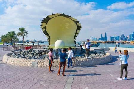 View of Oyster and Pearl Monument with fountain on Corniche seaside promenade at beginning of Dhow Harbor in Doha, Qatar