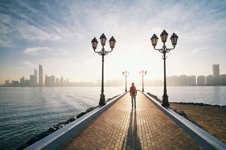 Young man walking on sidewalk against sea and urban skyline at sunrise. Abu Dhabi, United Arab Emirates