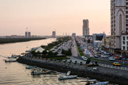 Ras Al Khaimah, United Arab Emirates - March 3, 2018: Ras Al Khaimah Corniche road and creek at dusk, the heart of northern emirate of the UAE