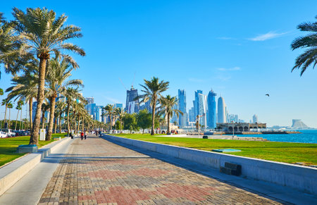 DOHA, QATAR - FEBRUARY 13, 2018: The walk along the West Bay with a view on green palms of local park, on February 13 in Doha.
