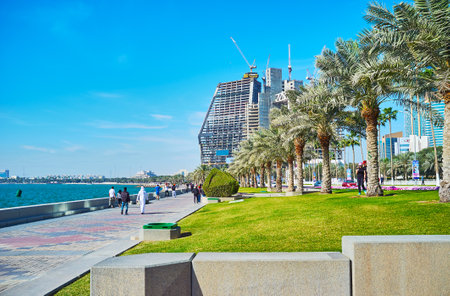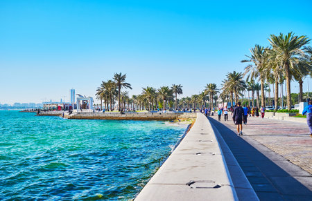DOHA, QATAR - FEBRUARY 13, 2018: The daily seaside walk on Al Corniche promenade, stretching along the modern skyscrapers of Al Dafna district, on February 13 in Doha.