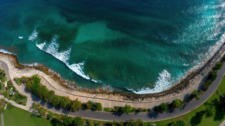 An overhead view reveals a coastline where foamy waves meet a rocky shore. The image showcases vibrant turquoise waters and dark blue ocean contrasts with the sandy beach and green vegetation along the edge. The shot employs natural sunlight and could be suitable for travel, environmental, or scenic applications.
