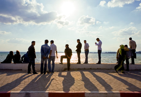 Hammamet, Tunisia - May 6, 2007: Local young people on the seafront at sunset