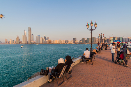 ABU DHABI, UAE - MARCH 7, 2017: People watch the skyline of Abu Dhabi from the Marina Breakwater, United Arab Emirates