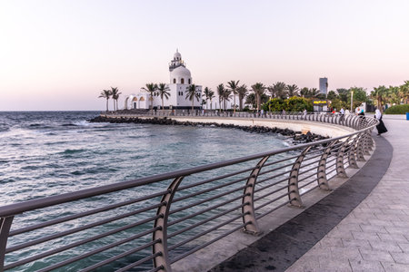 JEDDAH, SAUDI ARABIA - NOVEMBER 16, 2021: Island Mosque on the corniche promenade in Jeddah, Saudi Arabia