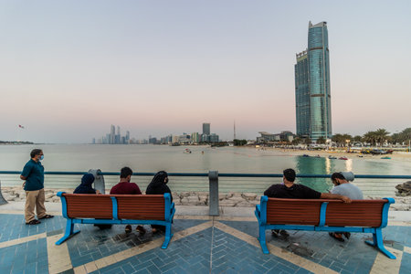 ABU DHABI, UAE - OCTOBER 22, 2021: Evening view of people at the corniche in Abu Dhabi, United Arab Emirates.