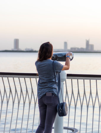 Caucasian tourist woman stands at scenic viewpoint, taking in enjoy stunning Abu Dhabi skyline panorama and beach, reflecting peace, relaxation, and urban beauty in the UAE