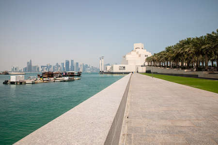 View on white Museum of Islamic Art in Doha City in Qatar with Persian Gulf water background nad raw of palm trees