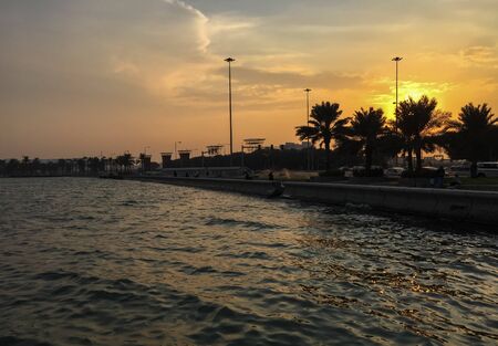 Beautiful sunset view at Doha Corniche, Qatar showing sea, road, sky, clouds and trees.