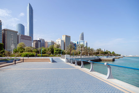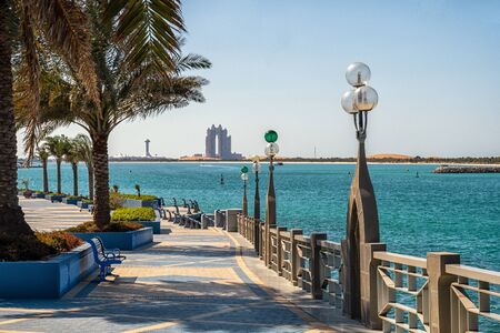 ABU DHABI, UNITED ARAB EMIRATES - JANUARY 27, 2017: Abu Dhabi Corniche walking area with landmark view of modern buildings on Corniche road, UAE