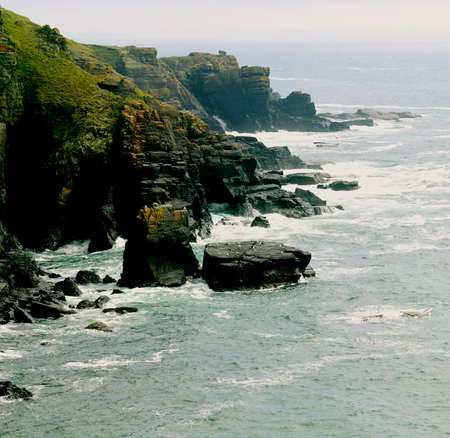 Rocky coastline with steep cliffs and waves crashing against the shore under cloudy sky.